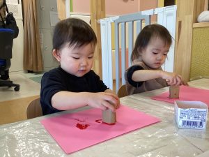 ダンボールで作ったハートの形に絵の具を付けペタペタ🎨