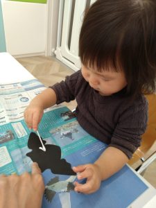 自分で破いた画用紙をどこに貼ろうか考えながら取り組むりんご組さん