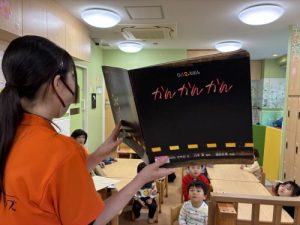 こんにちは!サンライズキッズ保育園国府宮園です☺今週の1冊は…「だるまさんが」という絵本です…