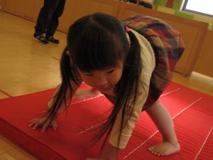 いよいよ前転に挑戦です。嬉しさとちょっとした不安が混ざったような表情ですが、「やってみたい!」という意欲の方が強かったようです☺️