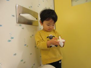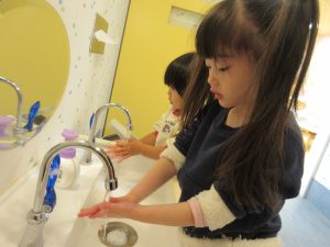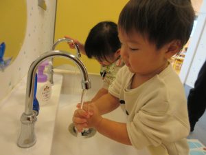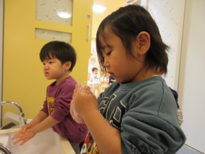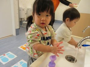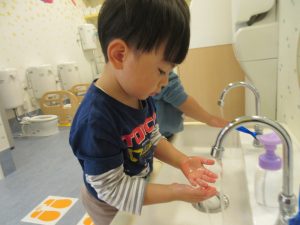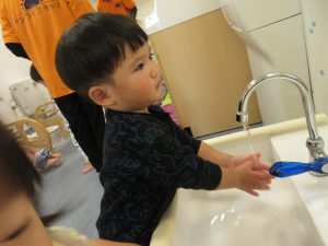 水が冷たくて「ちょっとぬらすだけ〜」の手洗いになりがちですが、しっかりと丁寧に洗い清潔にそして健康に過ごせるように見守っていきたいです。
