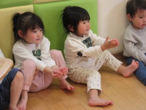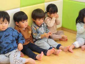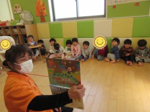 「おーちたおちた!」「なーにがおちた?」のやり取りをしながら、なにが落ちてきたのか尋ねると「みかん🍊」「りんご🍎」「どんぐり〜」といろいろな答えが返ってきました。