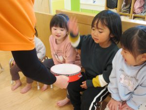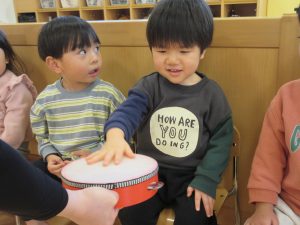 まずは、タンバリンを使ってリズム遊びです