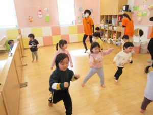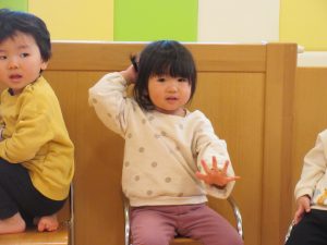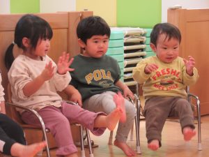 “こぎつねコンコン”では、手と足を使ってリズム遊びをしました