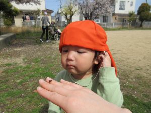 見つけると「おーい!てんとうむし〜🐞」と大きな声で伝え合い、「せんせー、とって〜😳❗️」