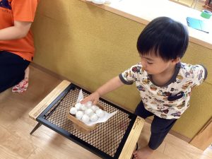 子どもたちが心を込めて作った素敵なお月見団子🍡を、三宝の上に丁寧にのせにいきました!