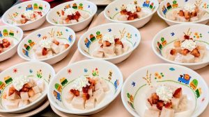(写真は離乳食後期です。年齢によって形、固さ、盛り付け量を変えて、提供しています。)