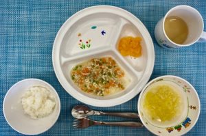 (写真は離乳食後期です。年齢によって形、固さ、盛り付け量を変えて、提供しています。)