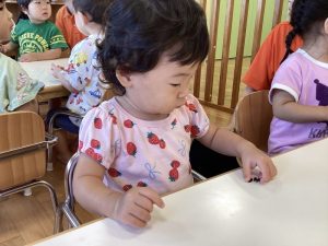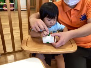 もも組さんも指先でシールをつかみ、保育士と一緒に貼ることができました🍀
