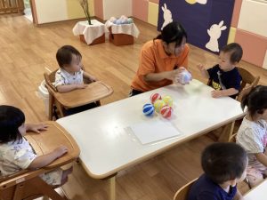 もも組さんはカラーボールに花紙をくっつけてお団子を作りましたよ🐥