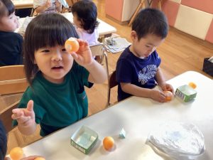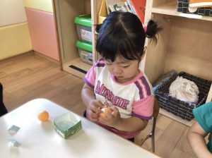 りんご組さんは、オレンジのピンポン玉に白いシールを貼ってお団子を作りました🍡