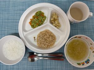 (写真は離乳食後期です。年齢によって形、固さ、盛り付け量を変えて、提供しています。)
