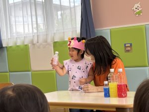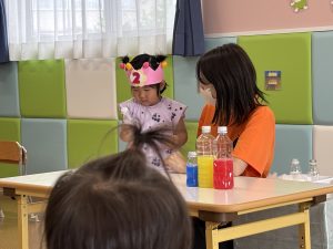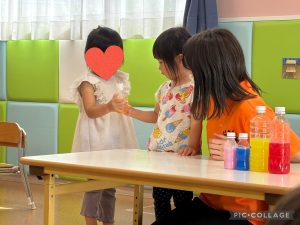 どんどん水に色が付いてきました!「えー!なんでー?!」と大興奮のお友だちでした🎵