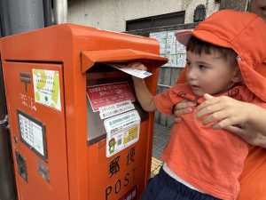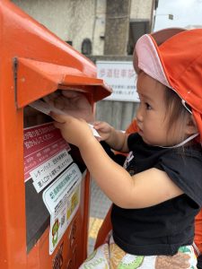 ポストに出しに行くのはみんなで行きました。ポストにお手紙を入れるのは初めての子もいて、ちょっと緊張気味だったり、嬉しくてニコニコしながら出したり、いろんな表情の子どもたちが見れました