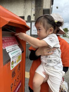 お友だちの中には、海を超えて外国のおじいちゃん、おばあちゃんに届く葉書もあります。小さなポストから、近くのおじいちゃん、おばあちゃんだけでなく、遠くのおじいちゃん、おばあちゃんにも届けられるなんて、素敵