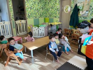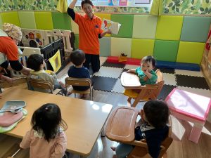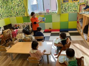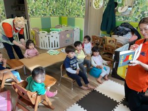 今週は、もも組さんとりんご組さんが一緒に給食を食べることが多かったので、絵本も一緒に聴きました。その様子をお伝えしますね♡