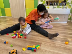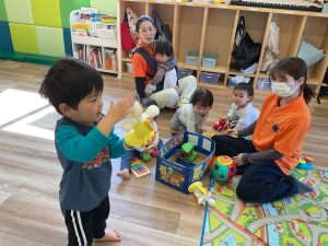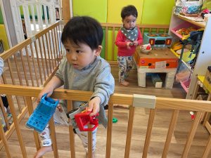 初めまして、のお友だちはちょっと涙が出ちゃったり、周りの様子をよーく見ていたり、おもちゃに向かっていって遊び出したりと様々。昨年も在籍してくれていたお友だちは、新しいお友だちに興味津々。