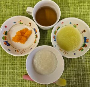 みんなで食べる給食はとても楽しそうで、ニコニコしながらたくさん食べていました♪離乳食を食べている園児さんも残さずに完食!野菜だけの煮物もしっかり食べていました!(^^)!