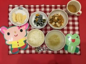 ★マ-ボ豆腐 ★中華ス-プ ★わかめとしらすの酢の物 ★りんご ★お茶