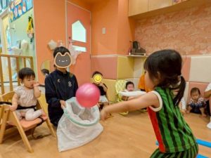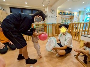 二本橋はバランスが取りやすいですが、一本橋は両手を広げバランスを保ちながら歩かないとバランスを崩しすぐに落ちてしまいます。お子さまたちは自ら両手を広げ落ちないようにバランスを取り渡りきります。ほんとに上手です!ボール運動はボールの動きにあわせて身体を動かすことで集中力、瞬発力などの反射神経が身に付き、またボールを捕って、相手に投げることで、距離感覚や方向感覚が育ちます。更に、お友だちと協力することで協調性が育まれ、楽しみながらお子さまたちの成長を促すことにも繋がっていきます。バランス感覚や身体コントロール能力も向上し、将来的な運動能力の発達の土台作りになります。