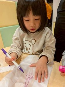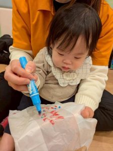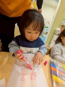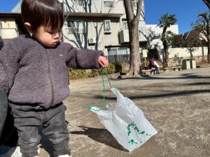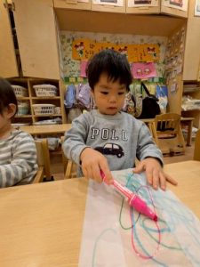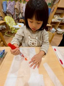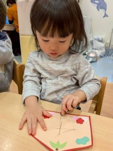 また、お外では、毎年恒例の凧揚げ🪁をしました。ス-パ-の袋にサインペンで色とりどりの模様を描き、オリジナルの凧を完成させました!完成すると、嬉しそうに「先生、みて〜!!」と見せてくれましたよ✨