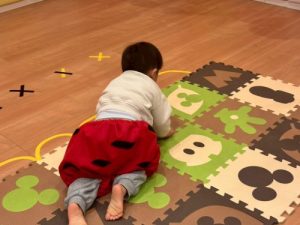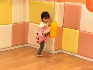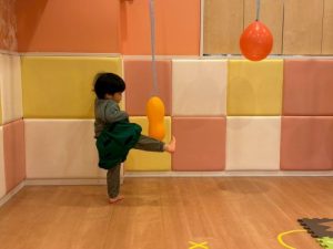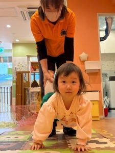 もも組さんといちご組さんはマットの上を転がり、りんご組さんは手押し車でバルーン鬼のもとへと進みました⚡️