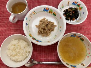 今日の給食は、人気のお肉メニュー!豚肉の生姜焼きでした!ご飯に合うメニューだったので、食べ進みが良かったです。