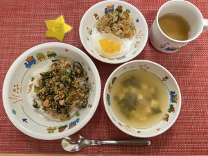 サンライズキッズ保育園 ◎給食の様子 今日は、すまし汁の中にほうれん草が入りました!緑の野菜が苦手な...