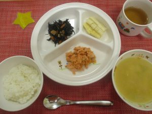 サンライズキッズ保育園 ◎給食の様子◎ 今日は、具だくさんなお味噌汁と鮭の塩焼き、ブロリーのご...