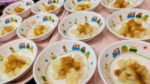 (写真は離乳食後期です。年齢によって形、固さ、盛り付け量を変えて、提供しています。)