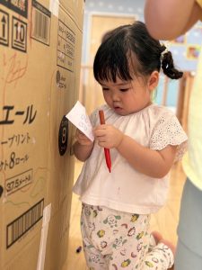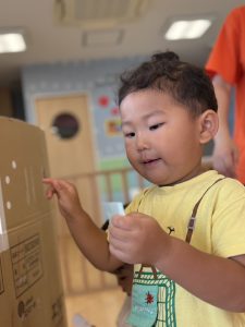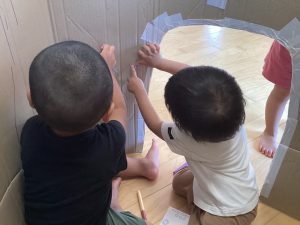 小さな空間に入ると安心するようで、「ここぼくのおうち!」「いっしょに入ろう!」と、お友だちを誘う姿もありました😊