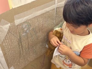 お家の中にダンボールのプチプチをはってみたり