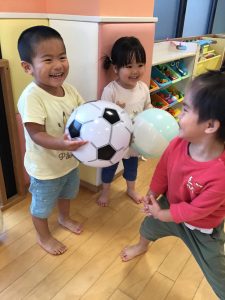 室内でも体を動かしたい時は、ビーチボールを使う時もあります![]()