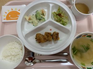 ご飯 味噌汁 鶏のから揚げ 梅和え ポテトサラダ