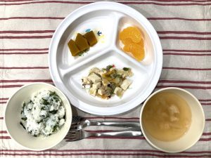 わかめごはん 味噌汁 豆腐チャンプルー かぼちゃの甘煮 みかん缶