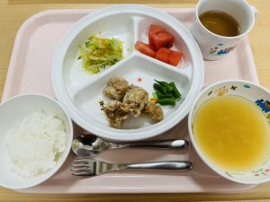 ご飯 味噌汁 鶏のから揚げ フレンチサラダ いんげんの塩茹で スイカ