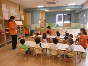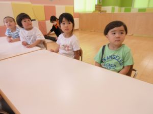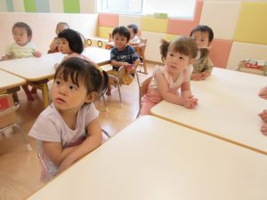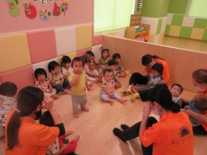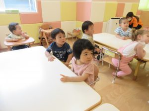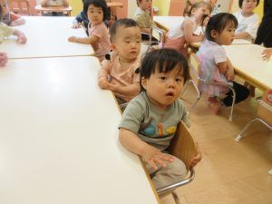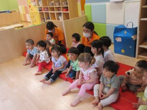 リトミックでは、「てをたたきましょう」や「あたまかたひざぽん」などの歌に合わせて歌っています!