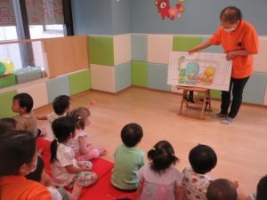 保育者の出し物では大型絵本の「きしゃにのって」です!