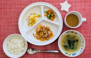 サンライズキッズ保育園 ◎給食の様子 今日は、みんなが大好きなチキンチャップでした。鶏肉をやわらかく...