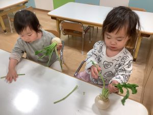 絵本の中に出てくるカブと実際のカブを見比べていますね!