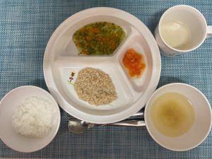 (写真は離乳食後期です。年齢によって形、固さ、盛り付け量を変えて、提供しています。)