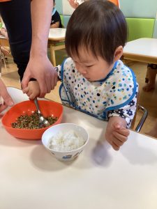 給食の先生に手作りふりかけを作ってもらい、子どもたちがご飯の上にかけました!