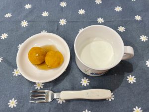 ご飯をいっぱいおかわりしてくれ、さらに保育士の先生の「デザートもあるよ~!」の言葉を聞くと嬉しそうな顔をして食べてくれました♪