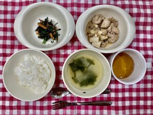 ご飯 味噌汁(大根) 鶏肉のすき焼き風煮 ひじきの和え物