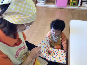 0歳児クラスのお友だちは、型はめ遊びや積み木遊びなどで形の認識も出来るようになってきているので、形遊びを楽しんでいきたいと思います![]()