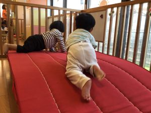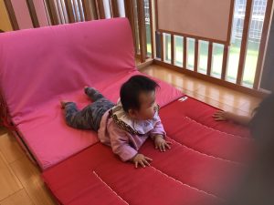 保育者と一緒にマットの上を歩いたりハイハイしたりして楽しみました![]()