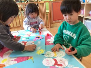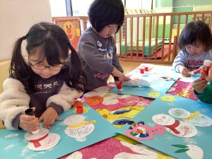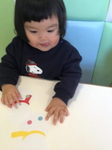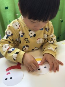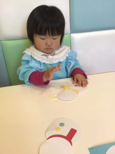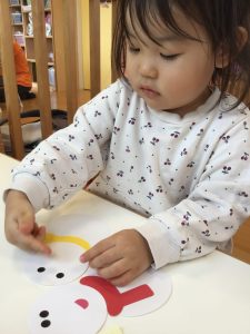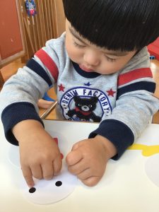 いちご組さんともも組さんはシールを貼ってお顔の出来上がり