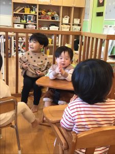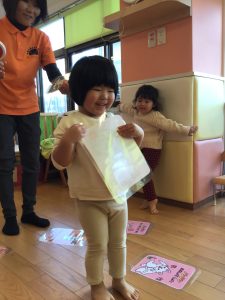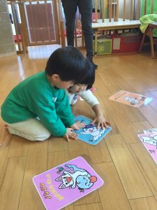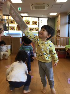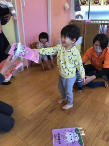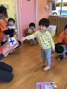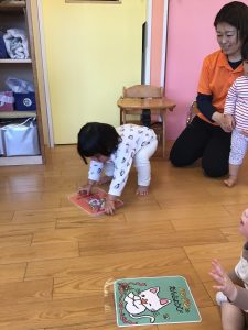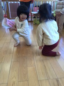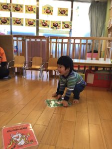 保育者の言葉を聞いて急いで取りに行き、ゲットできると大満足