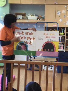 大型絵本「へんしんトンネル」では、みんな大きな絵本にびっくり