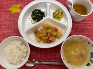今日の給食は、じゃが芋がとろ~りと煮えた肉じゃがとほうれん草のお浸しでした♪ 肉じゃがのおかわりをする子が多かったです。